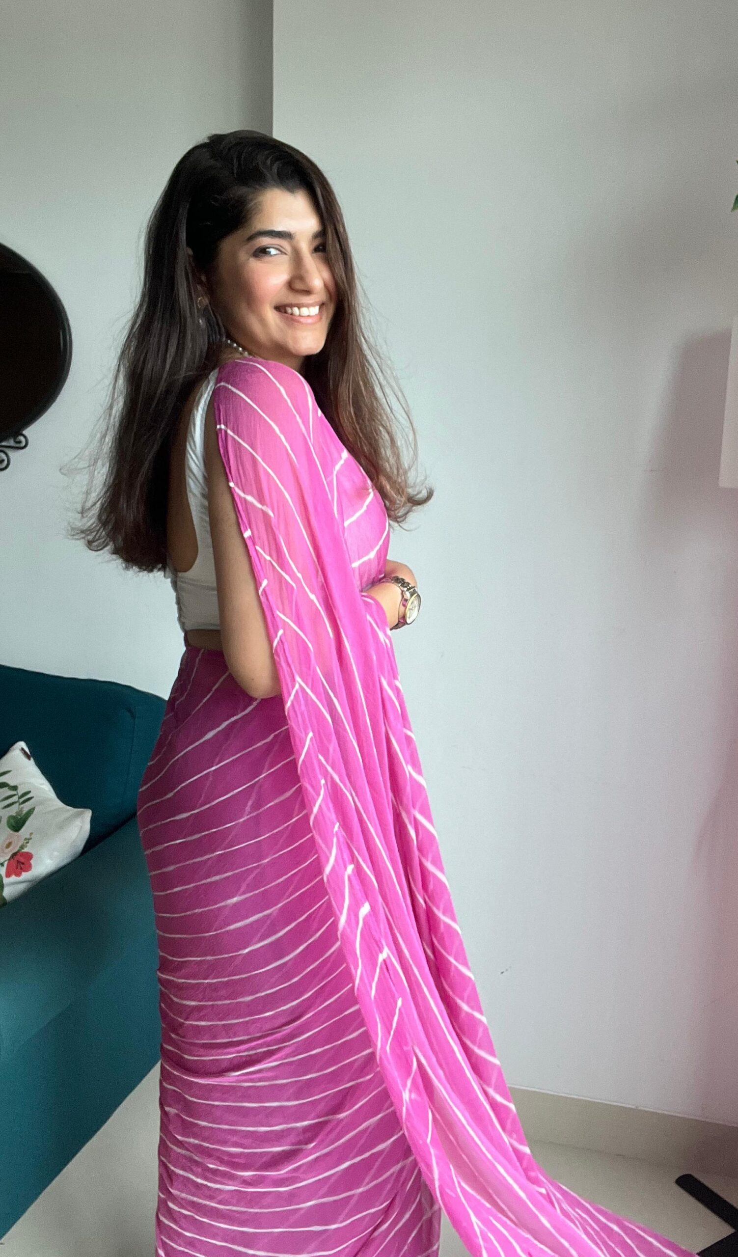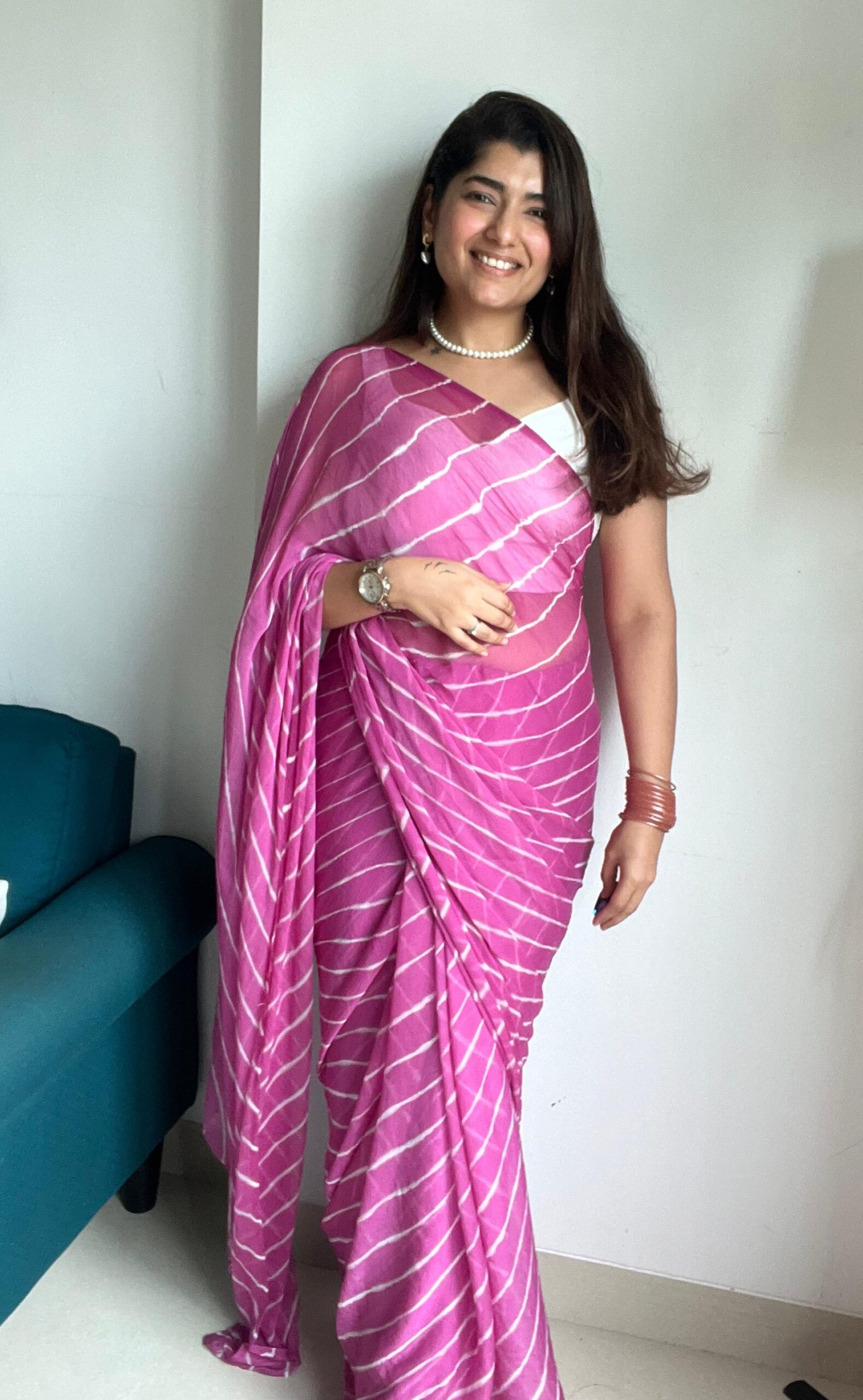 Delicate and dreamy, this blush pink saree features classic Leheriya patterns on soft chiffon georgette. Its fluid drape and breezy feel make it perfect for festive mornings, haldi functions, or elegant daywear.