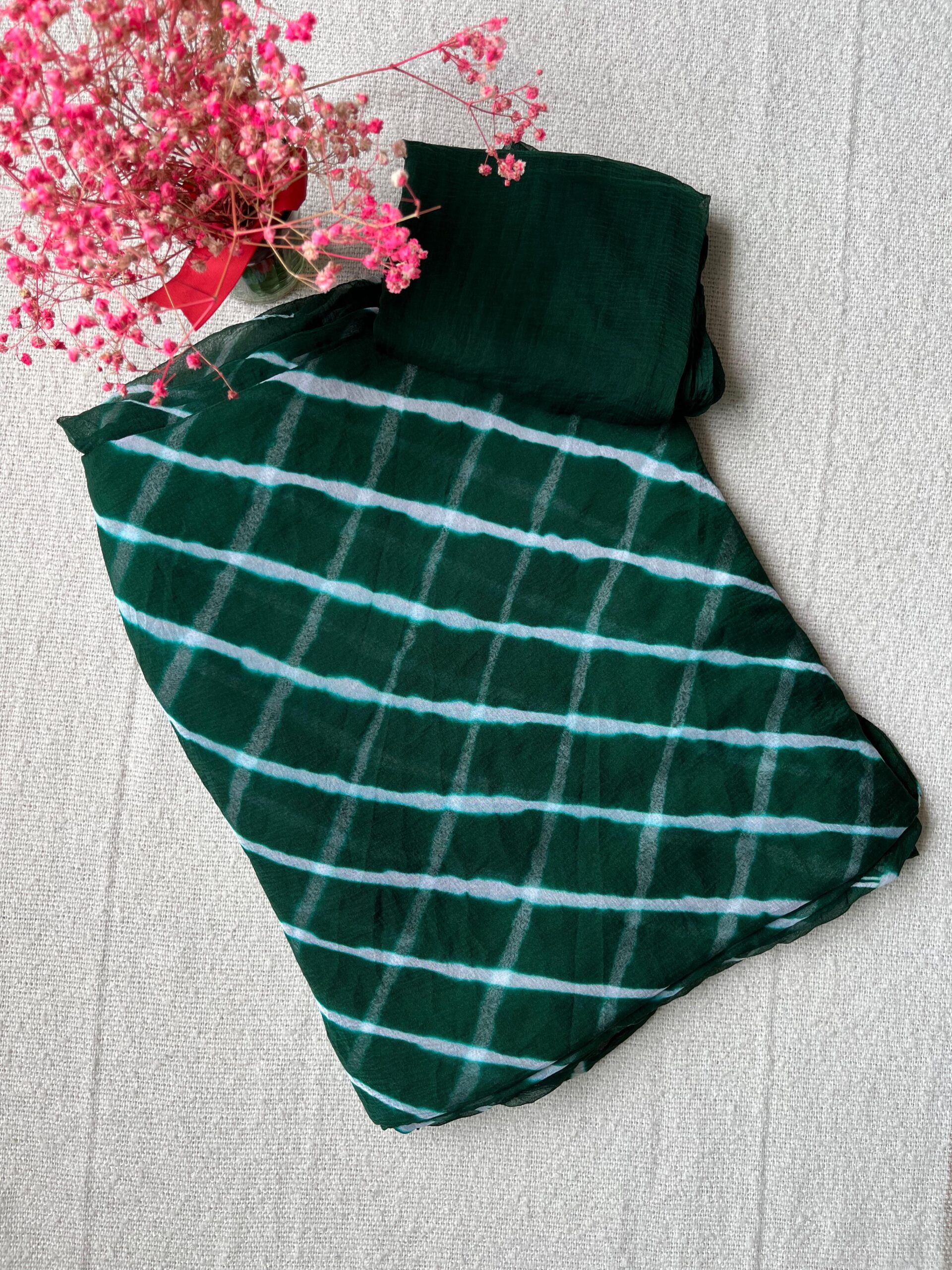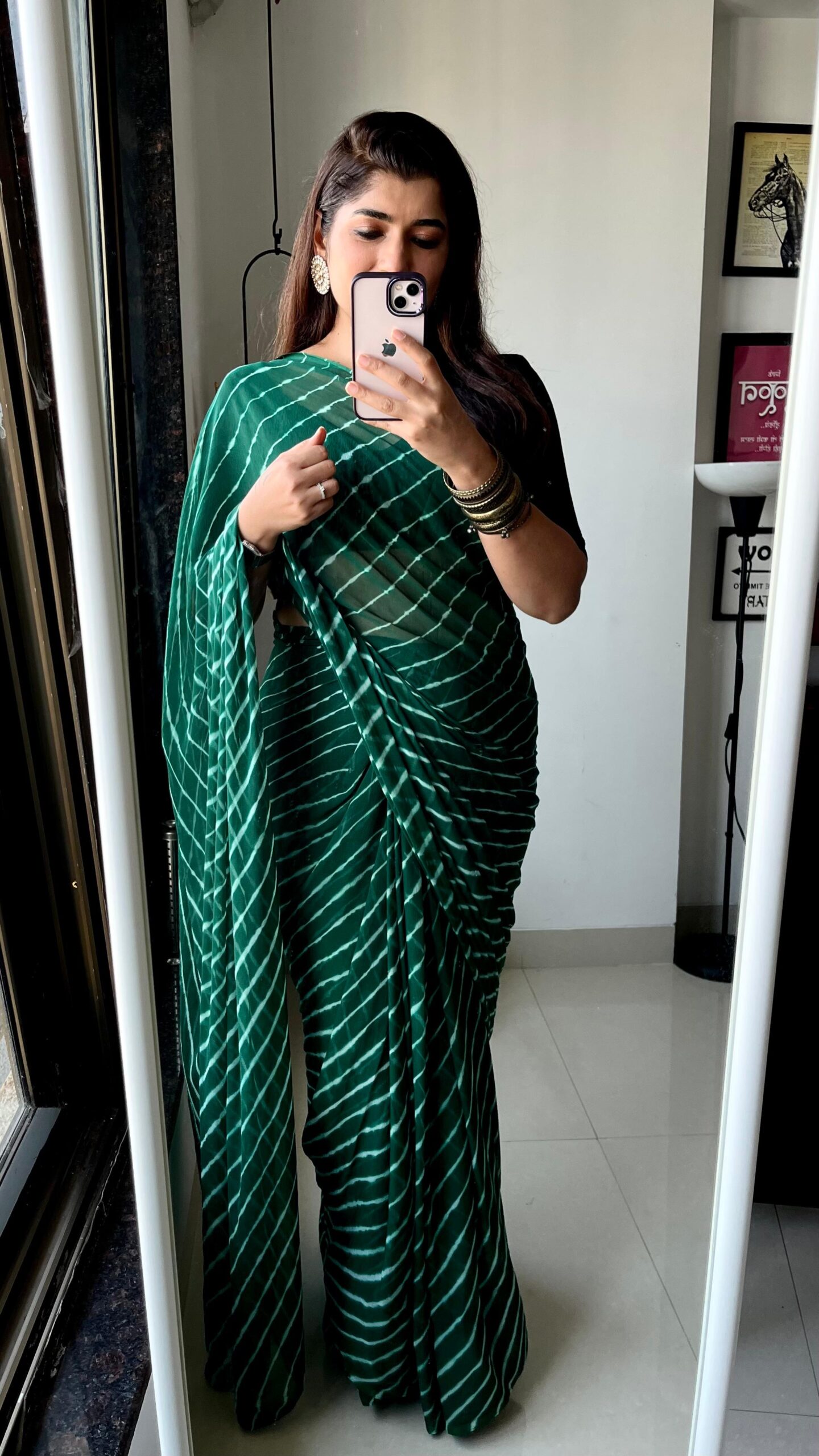 Rich in tone and tradition, this bottle green Leheriya saree flows effortlessly in lightweight chiffon georgette. A perfect blend of elegance and comfort for festive evenings or family celebrations.