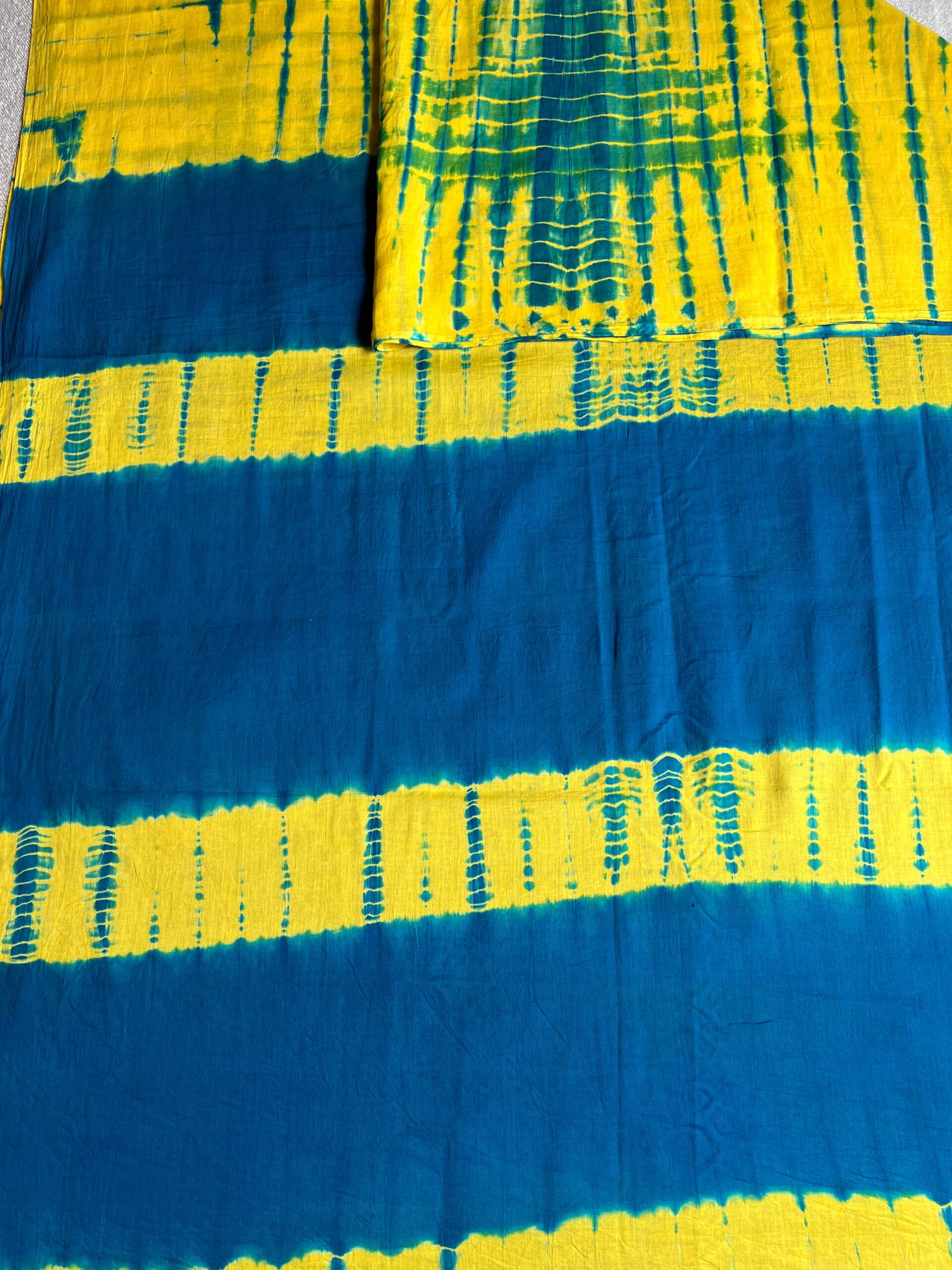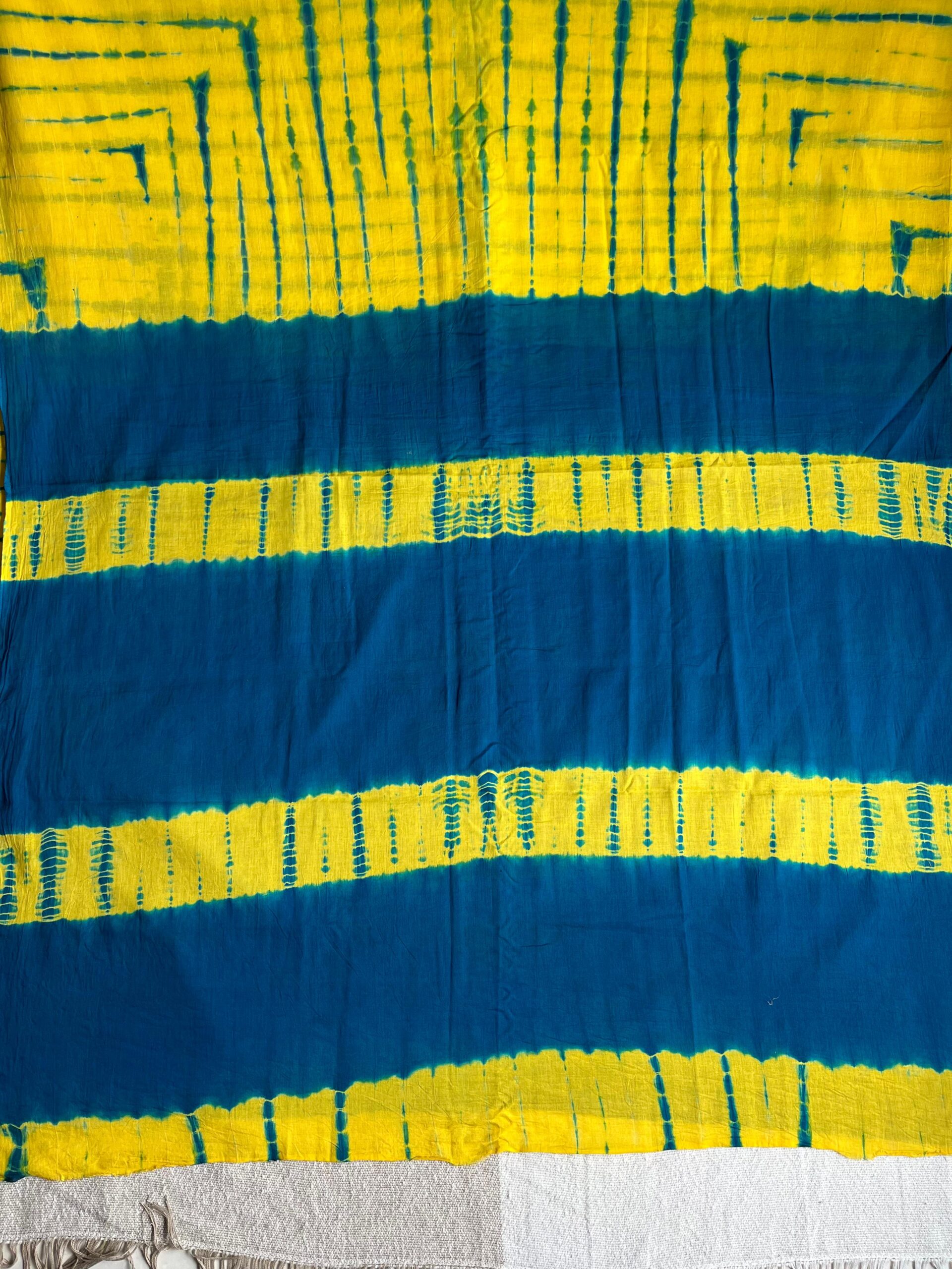 Bright and breezy, this Haldi yellow saree with teal Shibori print is perfect for festive mornings and casual outings. Soft mulmul cotton makes it light, breathable, and easy to wear all day.
