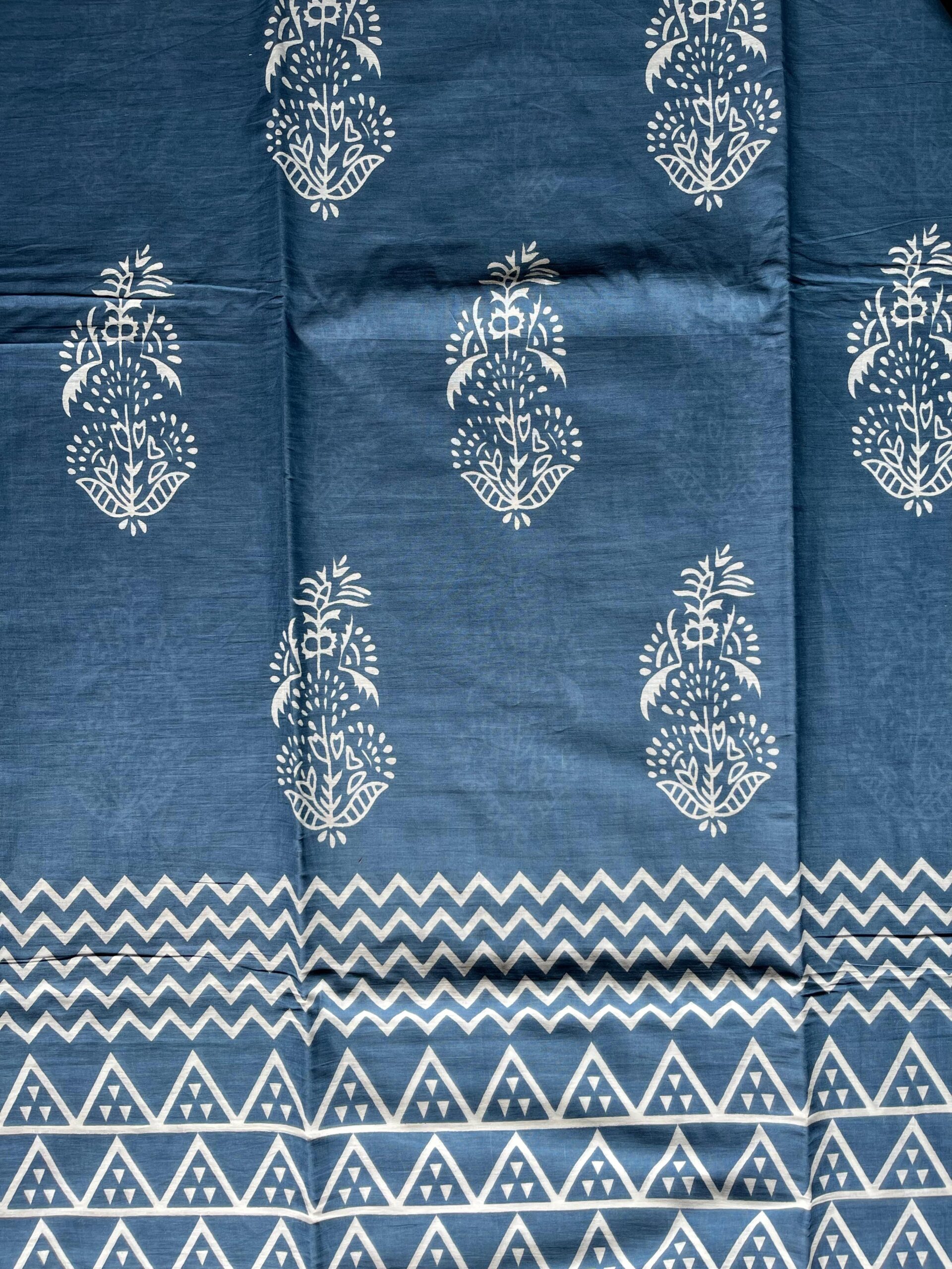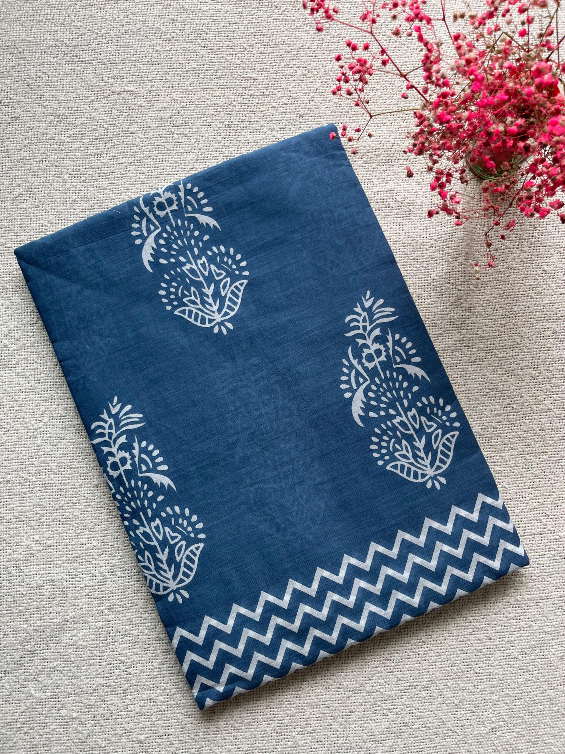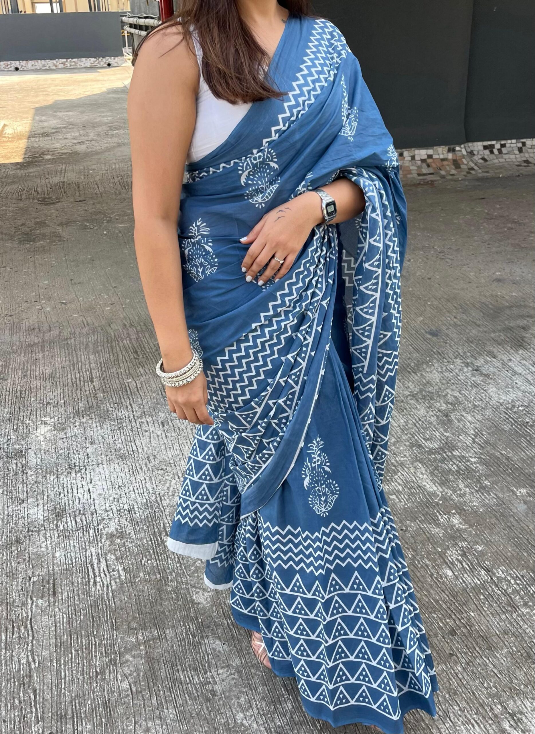 Embrace effortless charm with the Indigo Grace saree, crafted in ultra-soft mulmul cotton. Its deep indigo hand-block prints and airy texture make it a perfect pick for everyday elegance or casual outings.
