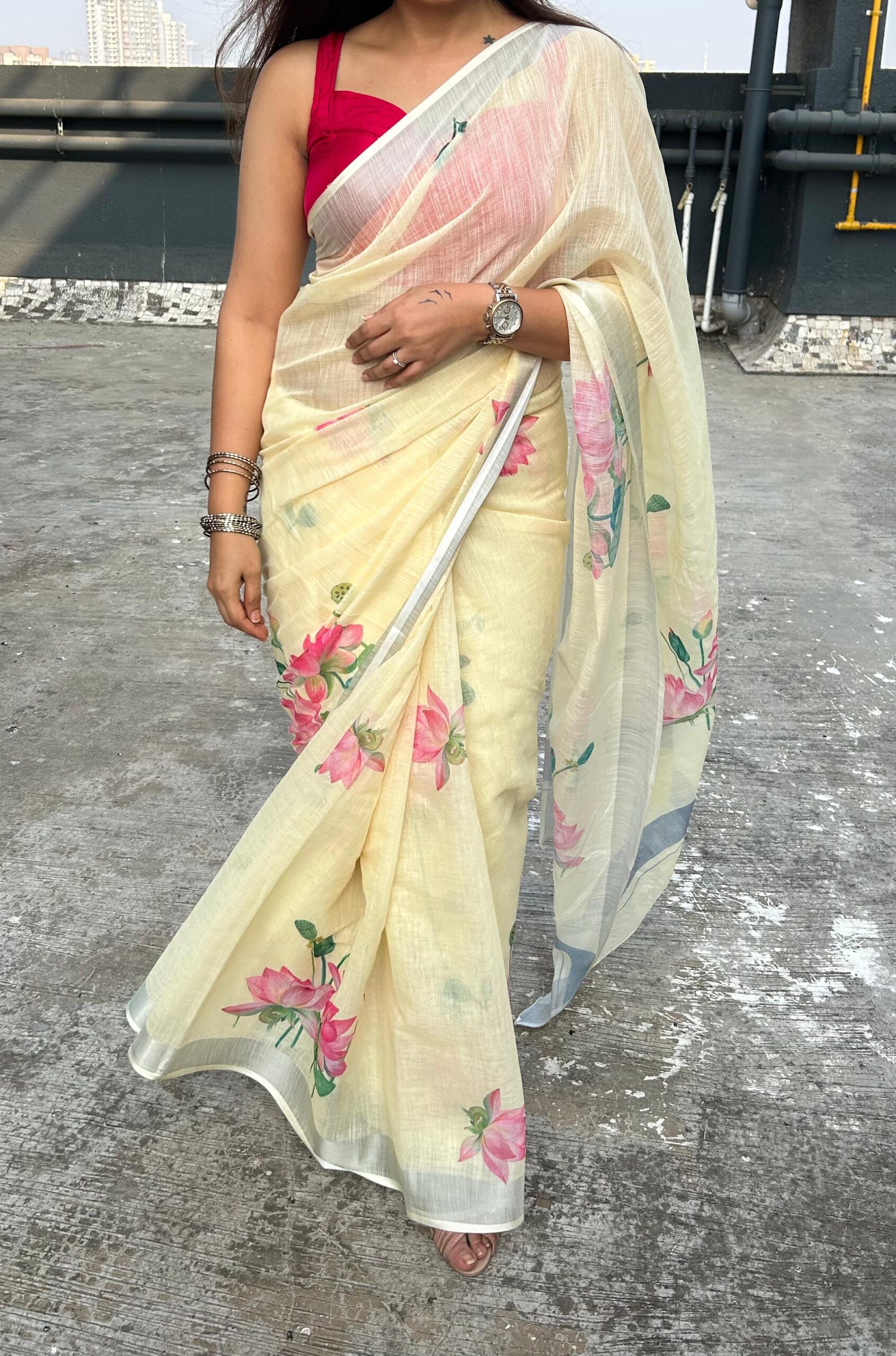 Radiate warmth and grace with this lemon yellow linen cotton saree, adorned with subtle floral charm. Its soft texture and gentle drape make it perfect for summer brunches, poojas, or light festive wear